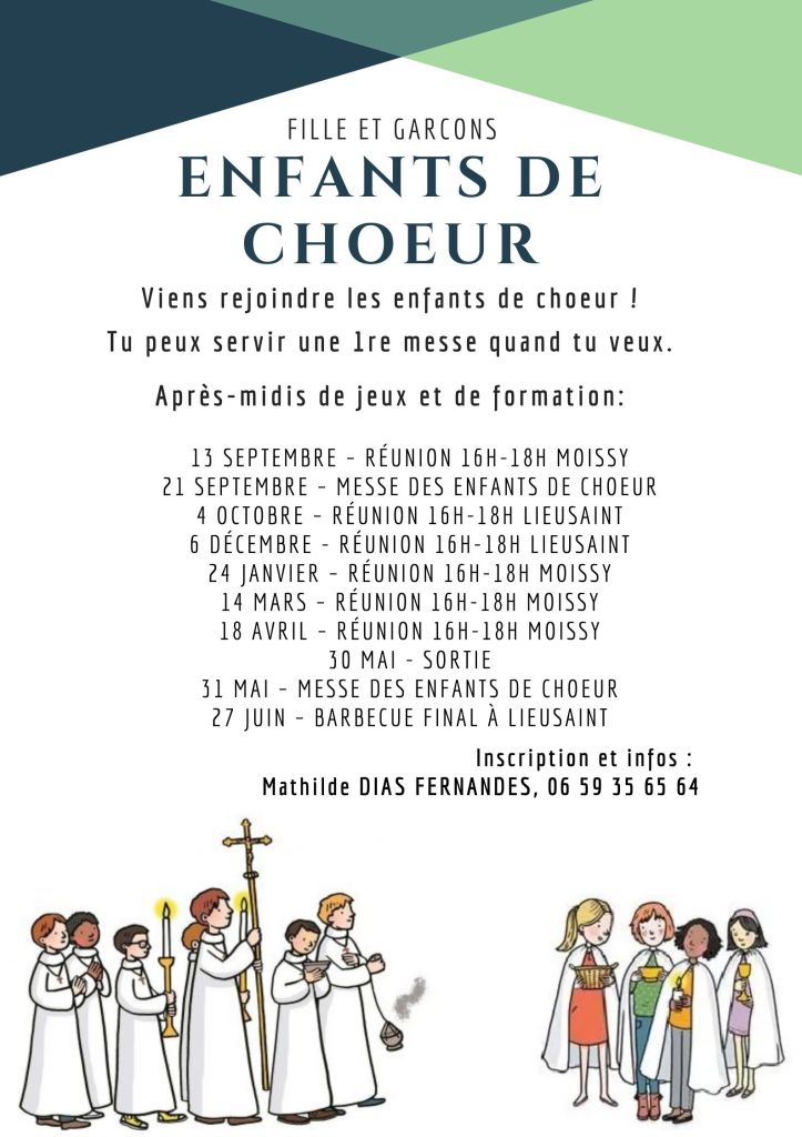 Les enfants de chœur, ce sont les Servants d’autel et les Servantes de la liturgie, garçons et filles. En plus de servir les messes, ils se retrouvent pour des rencontres régulières de jeu et de formation.
